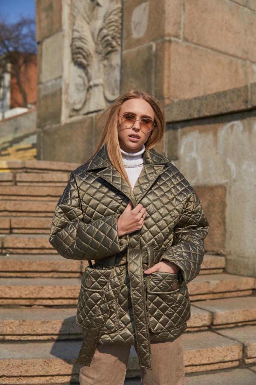 Стьобана жіноча куртка на гудзиках, прямого крою, з лацканами, в комплекті пояс тон. Стеганні моделі курток стали хітом сезону FW 2021/22. У своїх колекціях цей тренд підтримали такі модні будинки, як Celine, Miu Miu та Emilio Pucci. Особливості: у ролі утеплювача виступає силікон. Звертаємо увагу, що виріб розрахований на температуру +5°С. Характеристики: - фасон оверсайз - спущена лінія плеча - англійський комір - центральна застібка на гудзики - 2 накладні кишені - пояс у комплекті - на підкладці - утеплювач – силікон (80 г/м2) Склад: Верх: 100% поліестер Підкладка: 100% поліестер Утеплювач: 100% поліестер Розмір на фото 44 Зростання моделі на фото 175 см Цей товар в інших кольорах Розмірний ряд моделі: 42-50