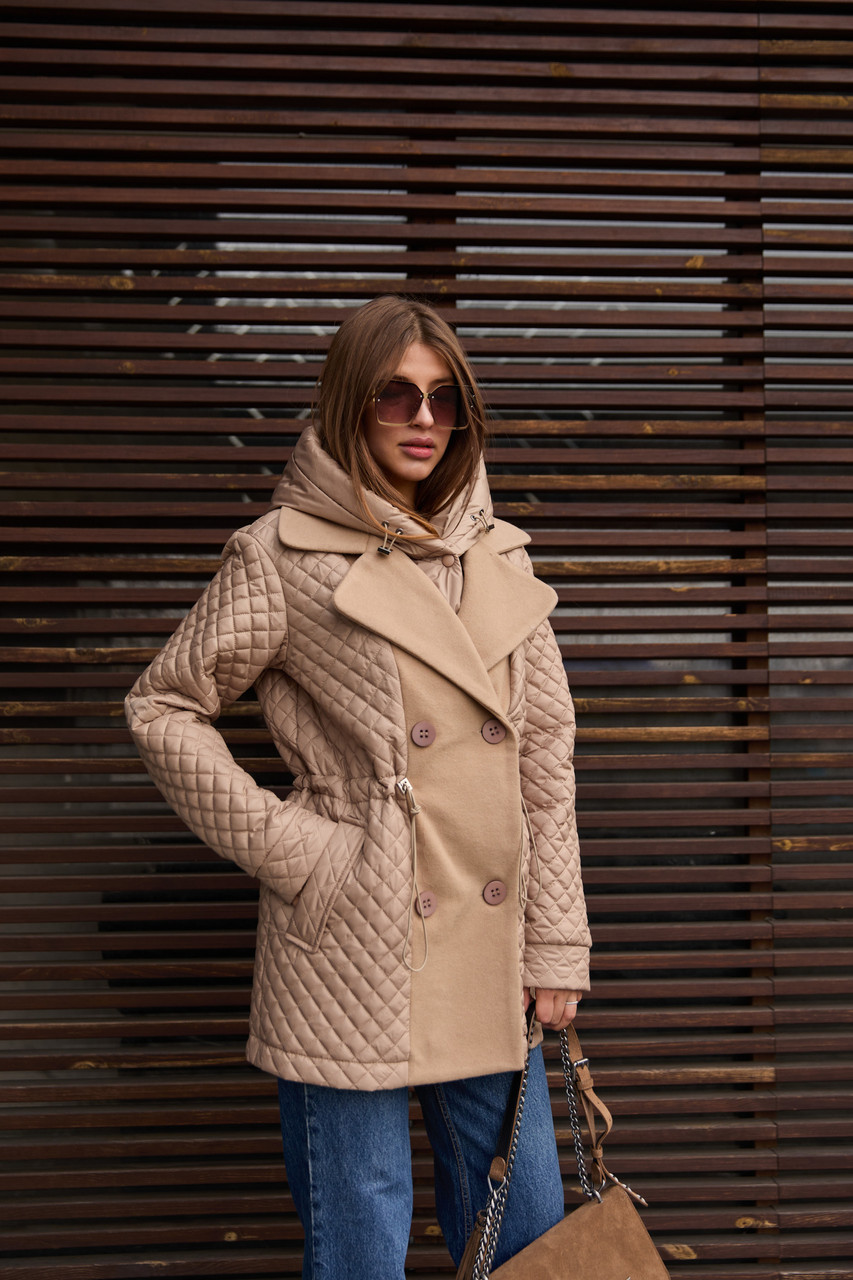 Комбінована модель-трансформер із стьобаної плащової тканини та кашеміру.