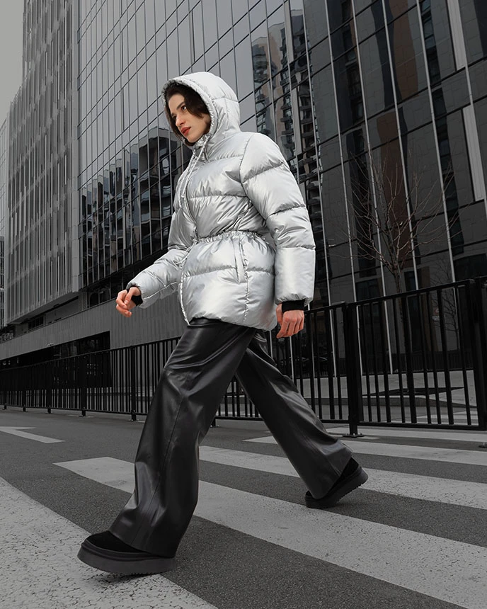 Продумана довжина виробу дозволяє захищати не лише верхню частину тіла, а й поперек та стегна, що особливо важливо під час зимових прогулянок. Капюшон із кулісою щільно прилягає, створюючи м’який захист від холоду та додаючи пуховику виразного зимового силуету.